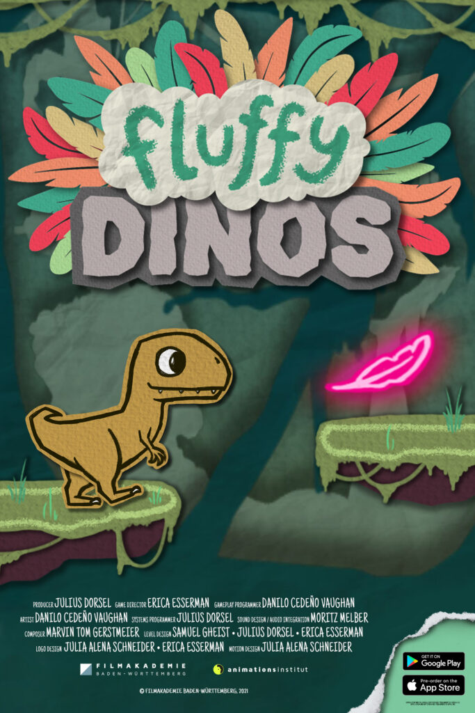 Fluffy Dinos is a mobile game developed in a team at the Film Academy Baden-Württemberg during the AniFilm/AniPlay project. We worked as a team of 7 people to develop the Fluffy Dinos IP world. We then split into two connected but separate teams– one to make an animated film and one to make an interactive experience. This mobile game is the result of that process. At its core, it is an auto-running platformer. You play as a little dinosaur who is collecting feathers. These feathers make you fluffier which changes how the dinosaur jumps and floats.